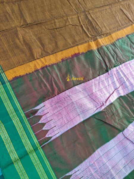 Olive Green Handwoven Ilkal viscose silk saree with pure silk tope teni pallu.