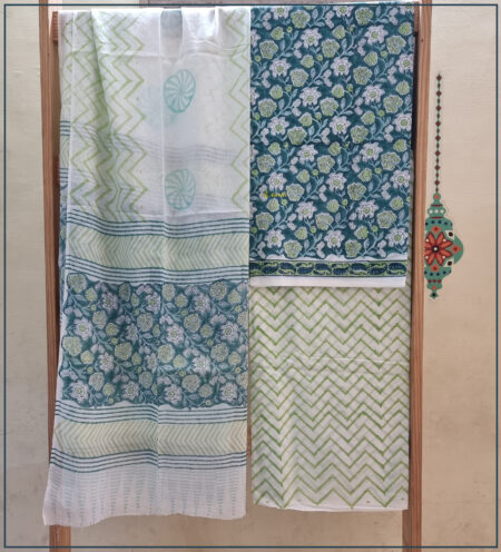Hand block printed pure cotton suit set in peacock green and white color.