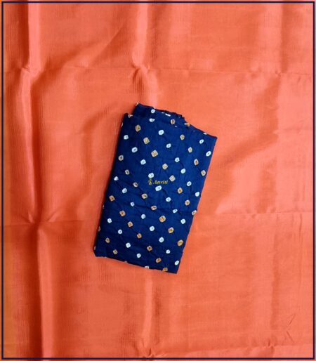 Dark peach handwoven plain Mangalagiri Silk by Cotton Saree with blue bandini cotton blouse piece.
