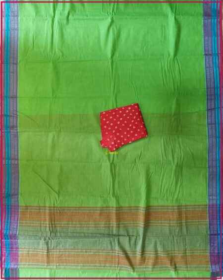 Parrot Green Handwoven Mangalagiri plain Cotton Saree with Blue and Pink woven thread border and Peachy Red bandini cotton blouse piece.