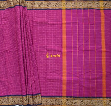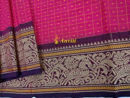 Purplish Magenta Checks Laksha Chukki Kanchi Cotton Saree with running blouse piece.