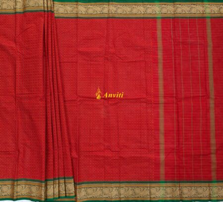 Red Checks Laksha Chukki Kanchi Cotton Saree with running blouse piece.