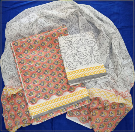 Handblock printed pure cotton suit set in Peach and white color with mul cotton dupatta.