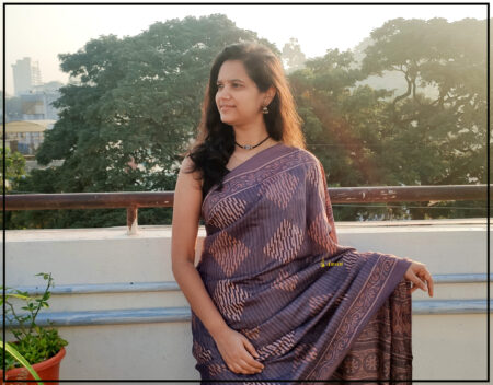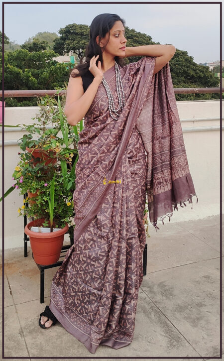 Eggplant color naturally dyed Ajrakh handblock printed Fine handwoven Tussar Silk saree.