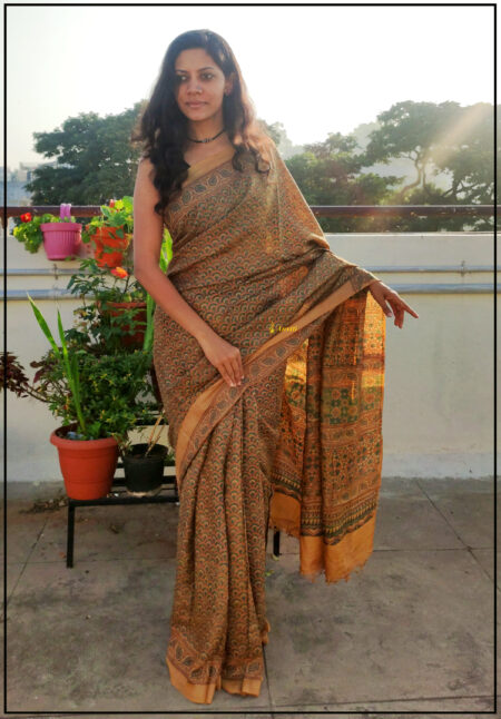 Olive Green color naturally dyed Ajrakh handblock printed Fine handwoven Tussar Silk saree.