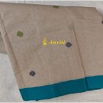 Beige pure Cotton handmade Jamdani Saree (without blouse piece). The saree has small multicolor jamdani buttas all over and a floral Jamdani pallu. Saree has pastel peacock blue border.