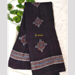 The perfect blend of tradition and fashion. Modal silk is a soft, shiny and highly lustrous fabric, achieved through interlacing modal fibers and silk yarns. The saree can be easily draped. Fine quality Ajrakh hand block printed Black saree is made using natural dyes.