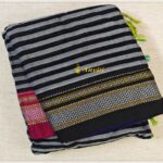 Saree: Beautiful Black and white stripes cotton hand-woven Ilkal Saree with traditional Ganaga Jamuna Chikki Border in Black and Magenta pink base. The tope teni pallu is in purplish blue color base.