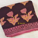 Modal silk is a soft, shiny and highly lustrous fabric, achieved through interlacing modal fibers and silk yarns. The saree can be easily draped. Pink and yellow hand block florals printed on black mix brown modal silk saree with peachy pink hand block printed blouse piece.