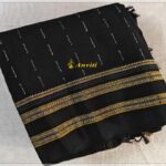 Saree: Black Slub cotton hand-woven Ilkal Saree with traditional Gayathri Border and tope teni pallu. Saree body has broken lines woven in white thread. The Gayathri border has white and mustard colors.