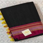Saree: Black hand-woven Ilkal Viscose Silk Saree with traditional chikki border in magenta and pink pure silk tope teni pallu.