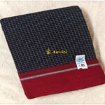 Saree: Black Pure cotton Ilkal hand-woven Pattedanchu saree. The red border has a straight seam white ‘PATTE’ that runs along the saree and hence the name PATTEDANCHU. The saree has white checks all over.