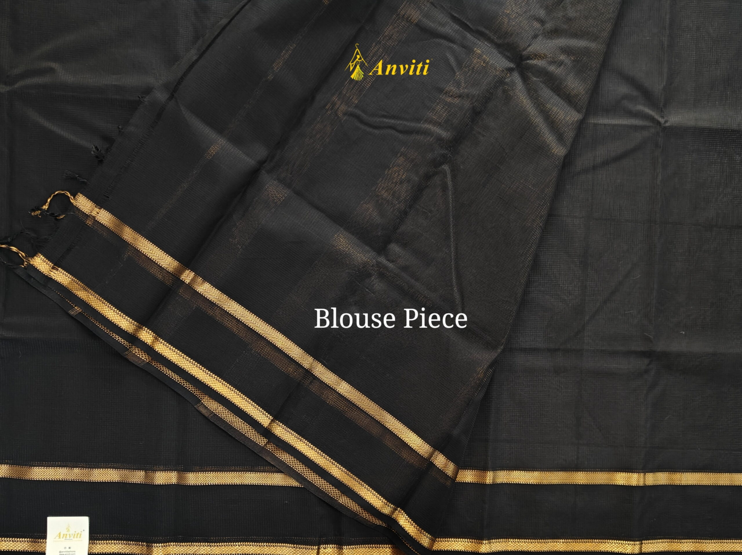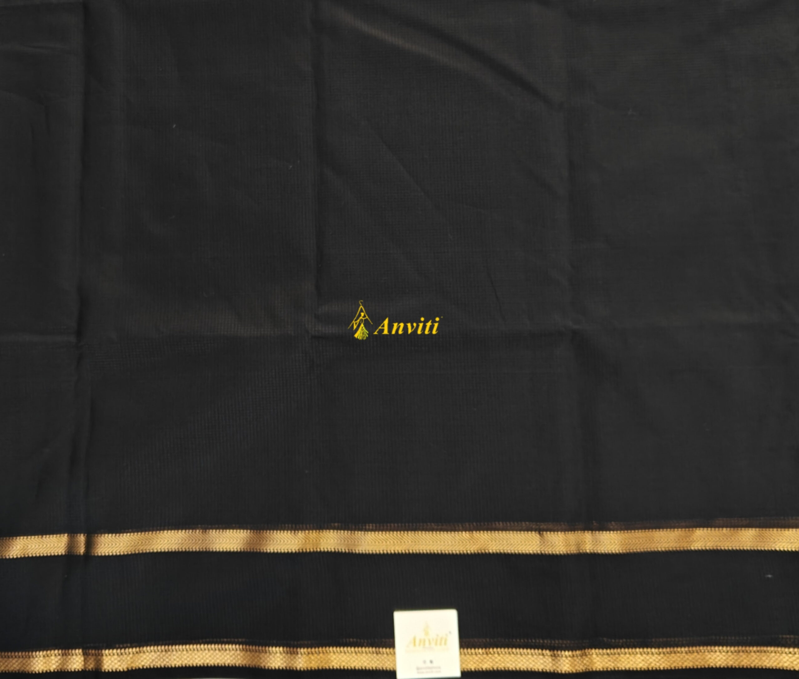 Black handwoven Maheshwari silk cotton saree with gold zari gap border. Saree has running blouse piece.