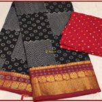 Traditional zari bordered Black Narayanpet pure cotton saree with beautiful handblock prints in grey and white.. Saree is having peacock zari border in gold and maroon selvedge. Paired with handmade cotton Bandhej blouse piece in Red.