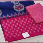 Handwoven Blue Double Ikat cotton saree with Pink border having diamond Ikat motifs. Saree has Floral ikat motifs all over and an magenta ikat pallu. Comes with Contrast baby Pink Ikat handwoven cotton blouse piece.