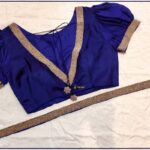 The dark Blue Cotton silk blouse has Golden beads embroidery on necklines (Front and back) and sleeve end. The puffed short sleeves makes the blouse look cute and traditional. The matching fixed belt also has beads embroidery.