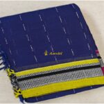 Saree: Beautiful purplish Blue Slub cotton hand-woven Ilkal Saree with traditional Ganaga Jamuna Chikki Border and tope teni pallu. Saree body has broken lines woven in white thread. The border has lemon yellow and magenta pink colors.