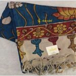 Blue Mangalagiri Silk Cotton Dupatta with beautifully hand drawn kalamkari design and gold zari border. The lotus designs are all over the dupatta with a peacock motif on border side. Traditional Kalamkari floral border design is on both ends of the dupatta. Natural colors are used in the Kalamkari process.