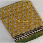 Yellow handblock printed Chanderi cotton silk saree with running blouse piece. The saree has a thin gold zari border on green base. Floral motifs are handblock printed all over the saree and pallu has triangle handblock prints in black and watermelon pink colors.. The off white blouse piece has small black handblock prints with green and thin gold zari border.