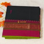 Dark Bottle Green Kanchi Cotton Saree with pink and gold zari woven border with parrot green selvedge. Small parrot green motifs are woven on the saree.