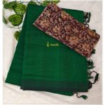 Dark Green hand-woven Mangalagiri Plain Cotton Saree with contrast maroon kalamkari cotton blouse piece. The pallu has self color embroidered scalloped edges