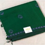 Dark Green soft, hand-woven Mangalagiri Cotton Saree with lavender strawberry handblock prints throughout the body and geometrical block prints on border and pallu. The running blouse piece is plain with white geometrical handblock prints on border.