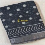 Saree: Handblock printed dark Grey linen by cotton saree with silver zari border – 5.5Mtr