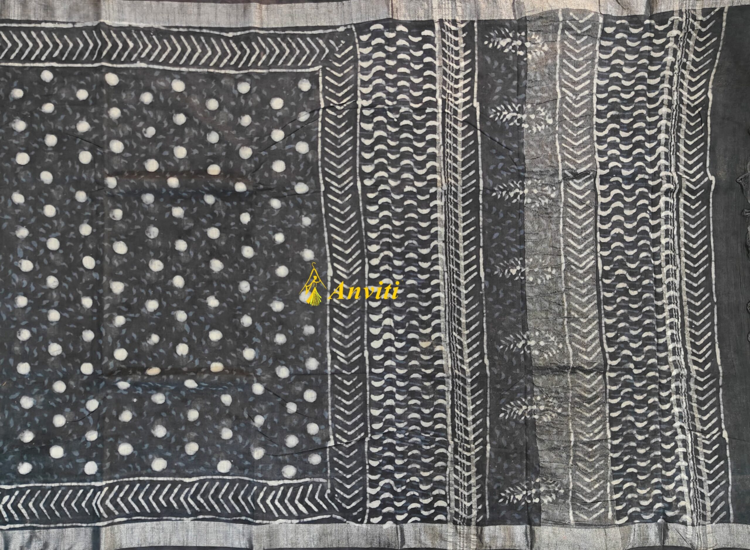 Handblock printed dark grey linen by cotton saree with silver zari border.