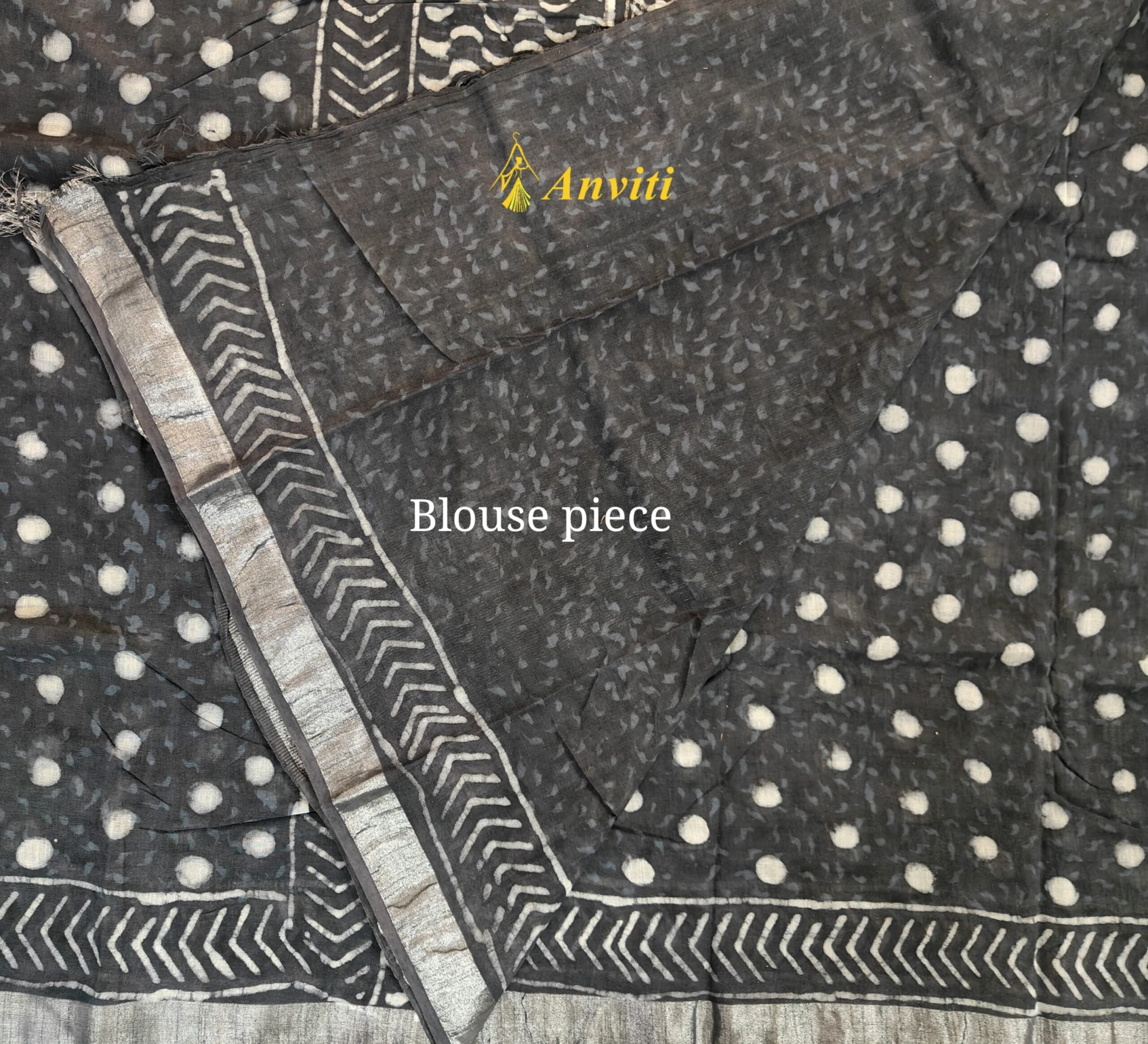 Blouse Fabric: Running grey handblock printed linen by cotton blouse piece with silver zari border (unstitched) – 90cm