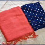 Dark Peach super lustrous and soft, hand-woven Mangalagiri Plain Silk by Cotton Saree with blue bandini cotton blouse piece.
