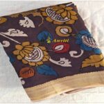 Beautifully hand drawn Kalamkari floral designs on Mangalagiri Silk saree with gold zari border. The base color is elephant grey and blouse is off white. Pallu has a big single peacock motif. Pen Kalamkari and dyeing process is done with all natural colors.