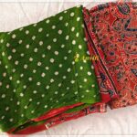 Ajrakh handblock printed and handmade Bandini Modal Silk saree in Madder Red and Olive Green combination. Modal silk saree is processed with Ajrakh techniques. Beautiful floral block prints are on madder red body and hand bandhej olive green pallu with red Ajrakh at the end of the pallu.