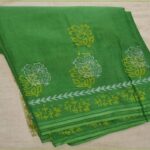 Soothing Green mul-mul cotton saree with floral and leafy handblock prints.. Pallu end has floral cotton gota patti style patch border. Saree has cambric cotton white and green floral blouse piece.