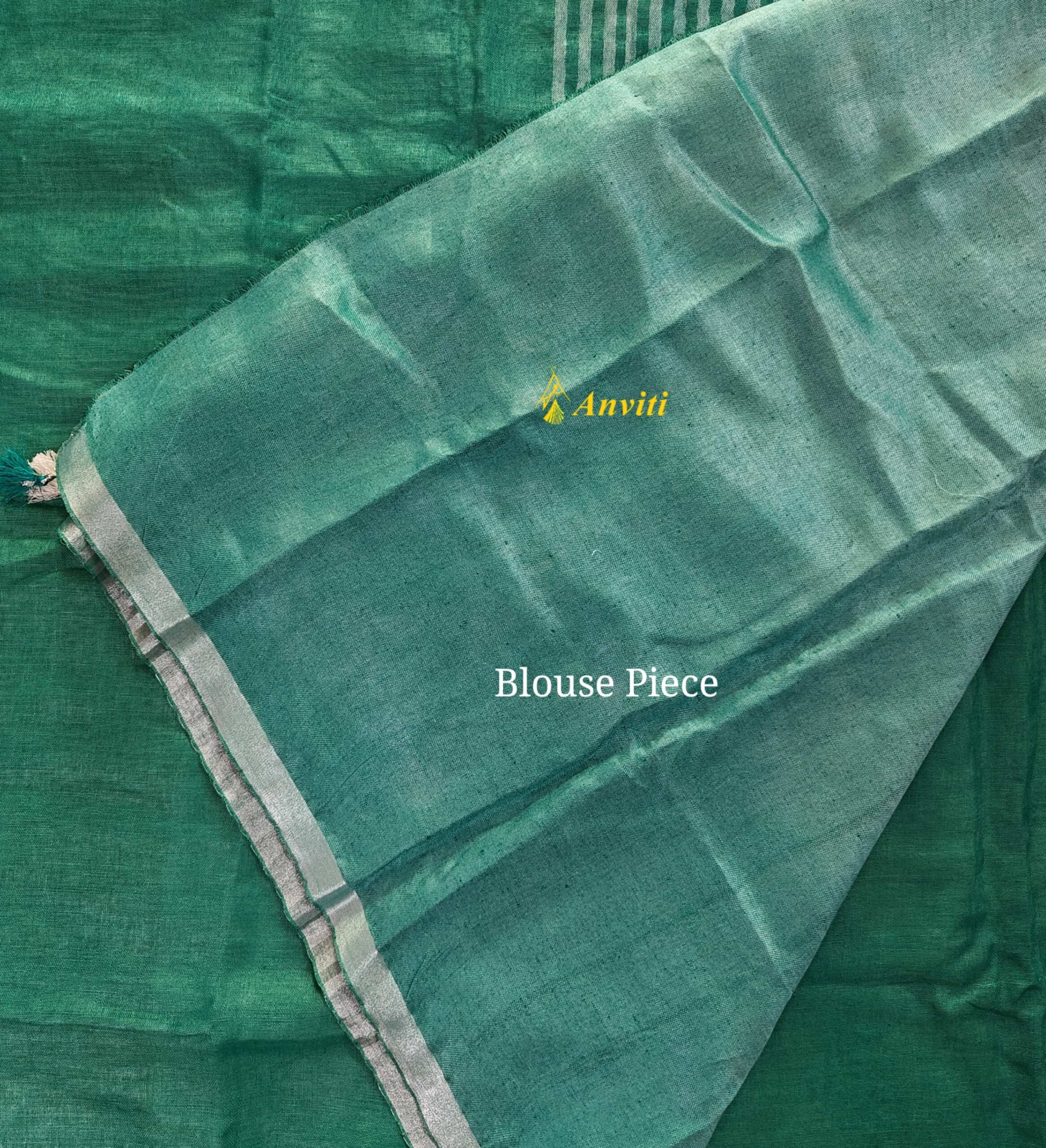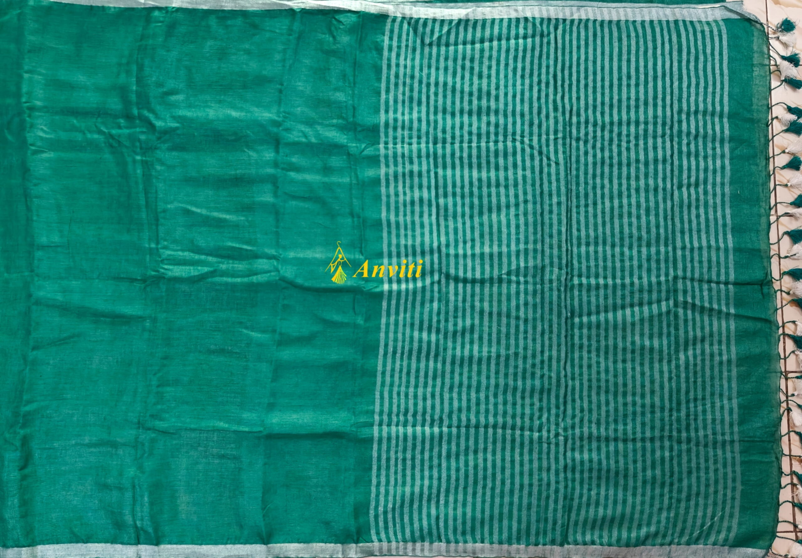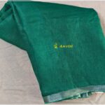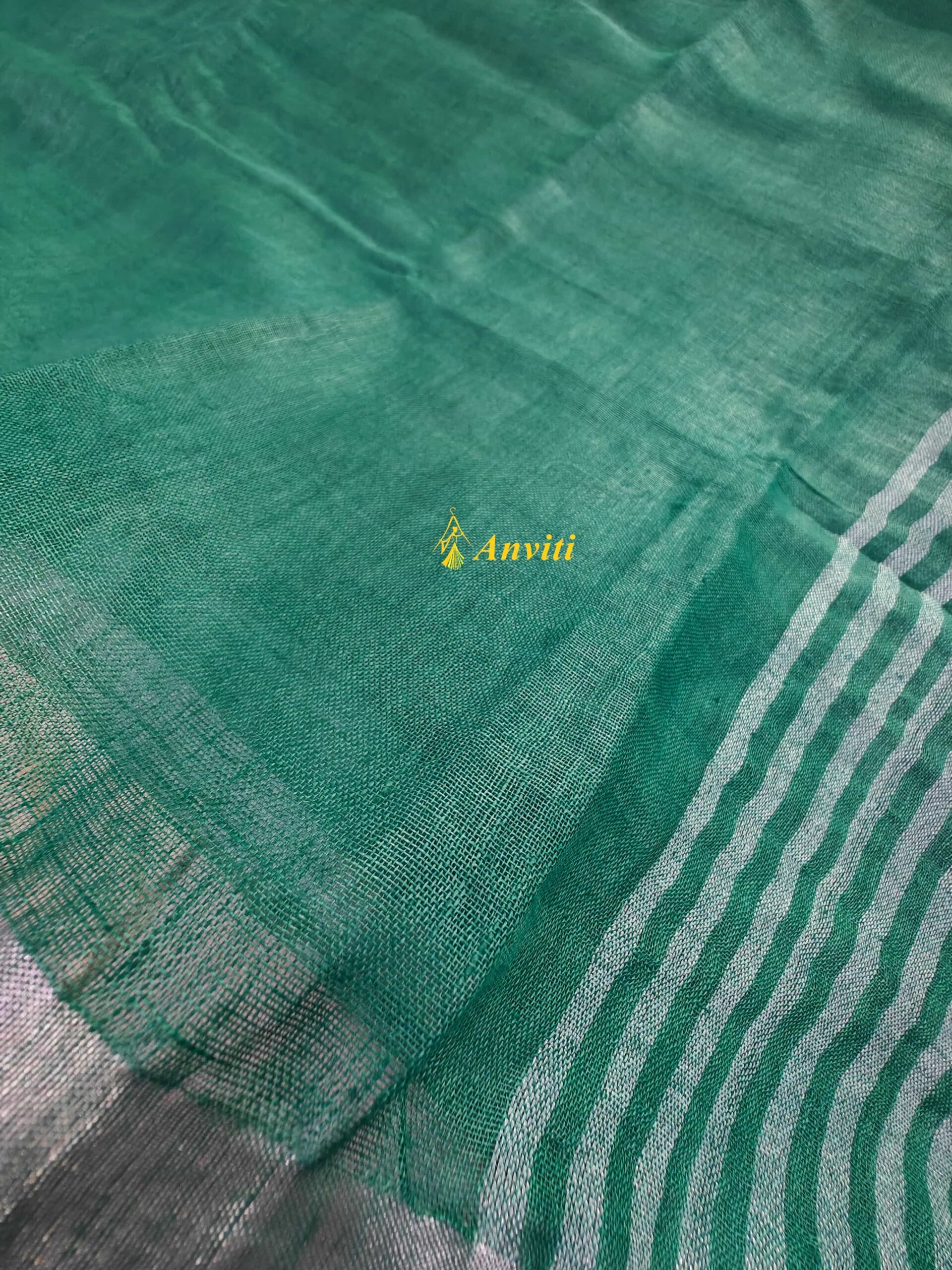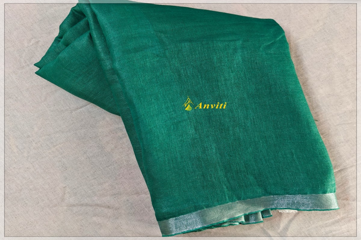 Saree: Plain Green pure linen saree with silver zari border – 5.5Mtr