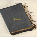 Handwoven Plain Grey Maheshwari Silk Cotton saree with thin gold zari border with beige geecha pallu and plain grey running blouse piece.