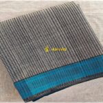 Light Grey (White and black missing checks) hand-woven Mangalagiri missing checks pattern Cotton Saree with contrast light blue thread woven border. The pallu has light blue stripes pattern and blouse piece is in light blue color with self horizontal stripes.