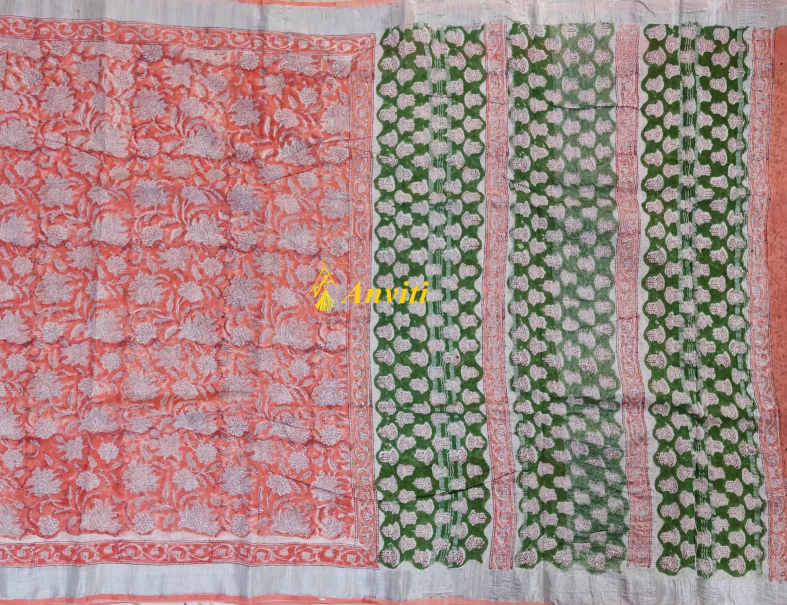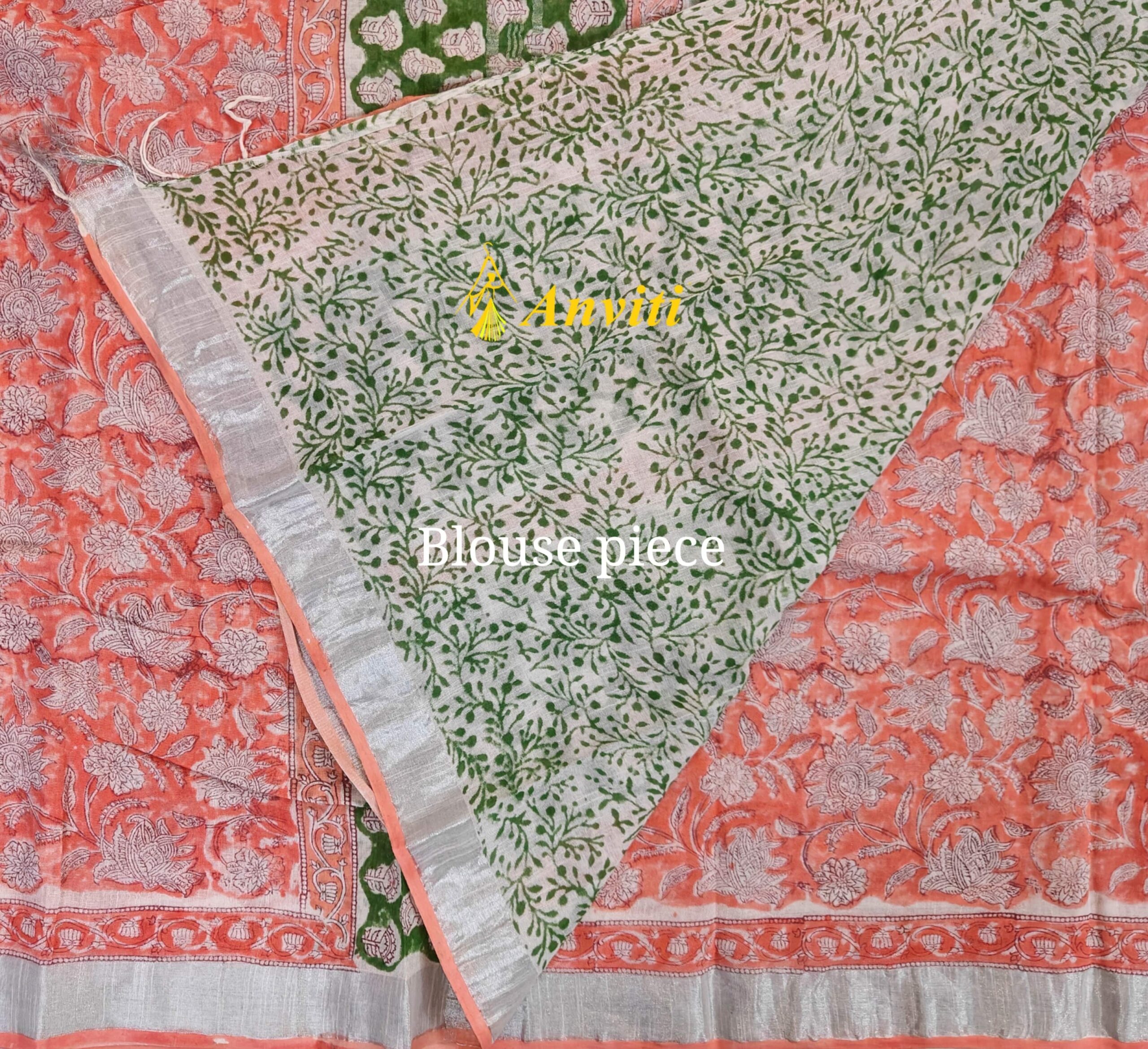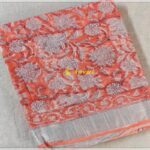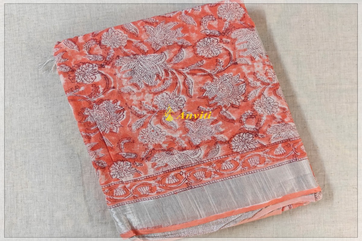 Saree: Handblock printed peach linen by cotton saree with silver zari border – 5.5Mtr