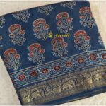 Ajrakh handblock printed Indigo Blue Dola Silk saree with gold zari woven border. The Indigo Blue blouse piece has gold zari buttas and border.