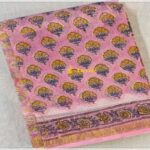 Lightweight, breezy and pretty light pink cotton Kota doria saree with beautiful Bagru hand block prints. Hand block prints are done with natural colors using wooden blocks. The saree has a thin gold zari border and running handblock printed white blouse piece.
