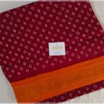 Maroon wax Sungudi pure cotton saree with orange border and pallu. The border has mango and floral golden motifs.