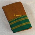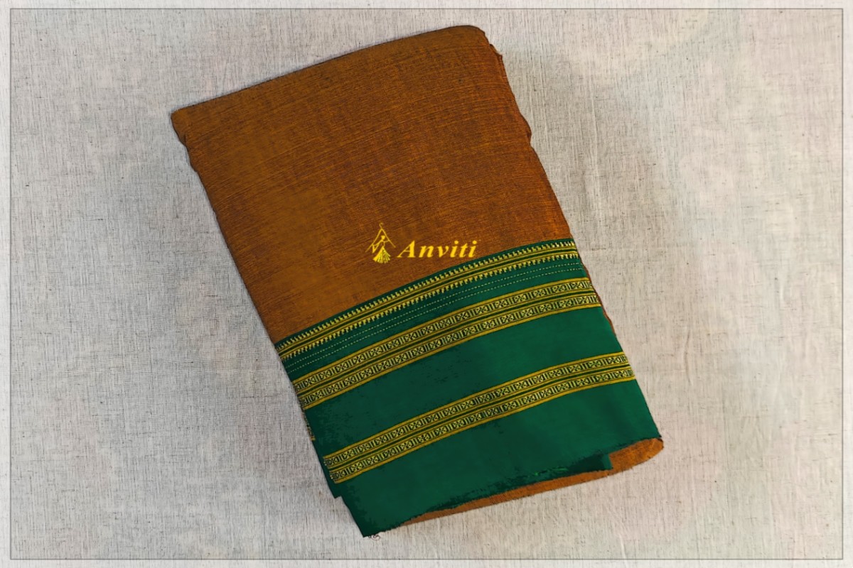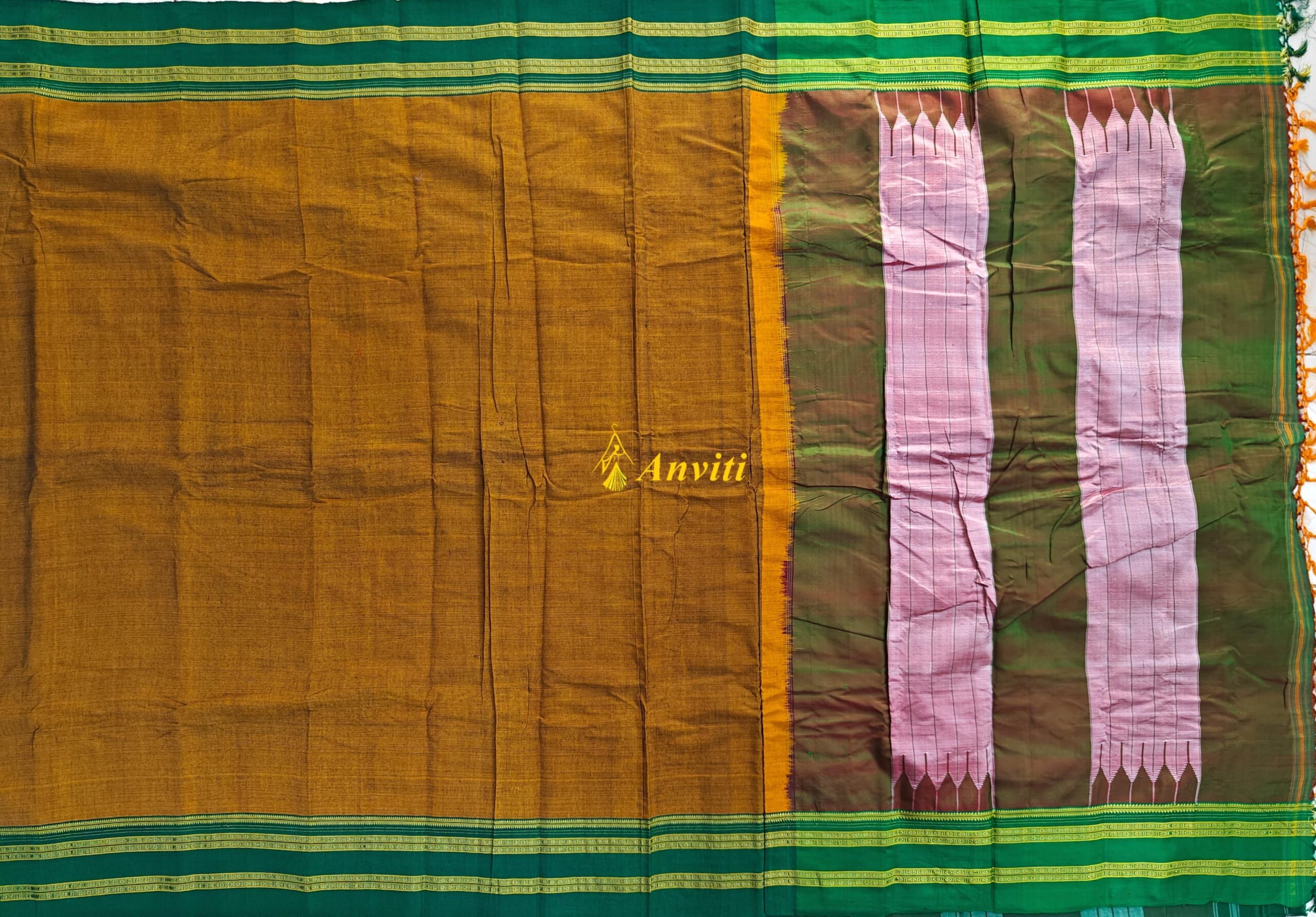 Saree: Dark Mustard hand-woven Ilkal Viscose Silk Saree with contemporary Green Gayathri border and olive green and silver color tope teni pallu. The border and pallu are in pure silk.