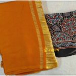 Plain Mustard Yellow Modal silk saree with gold lagdipatta pallu and contrast black Ajrakh handblock printed modal silk blouse piece.