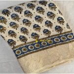 Ajrakh floral handblock printed Off White Dola Silk saree with gold zari woven border. The off white blouse piece has gold zari buttas and border.