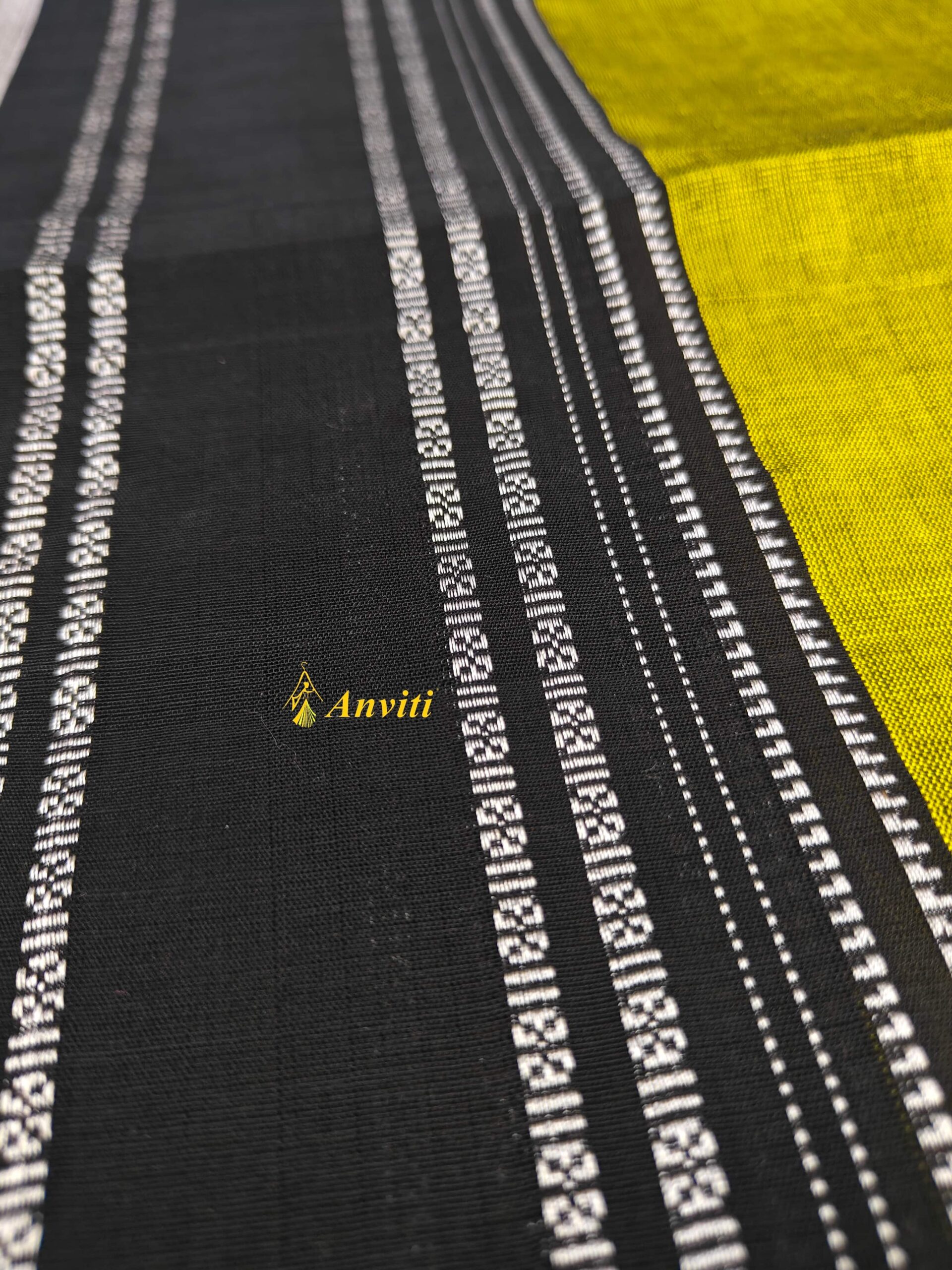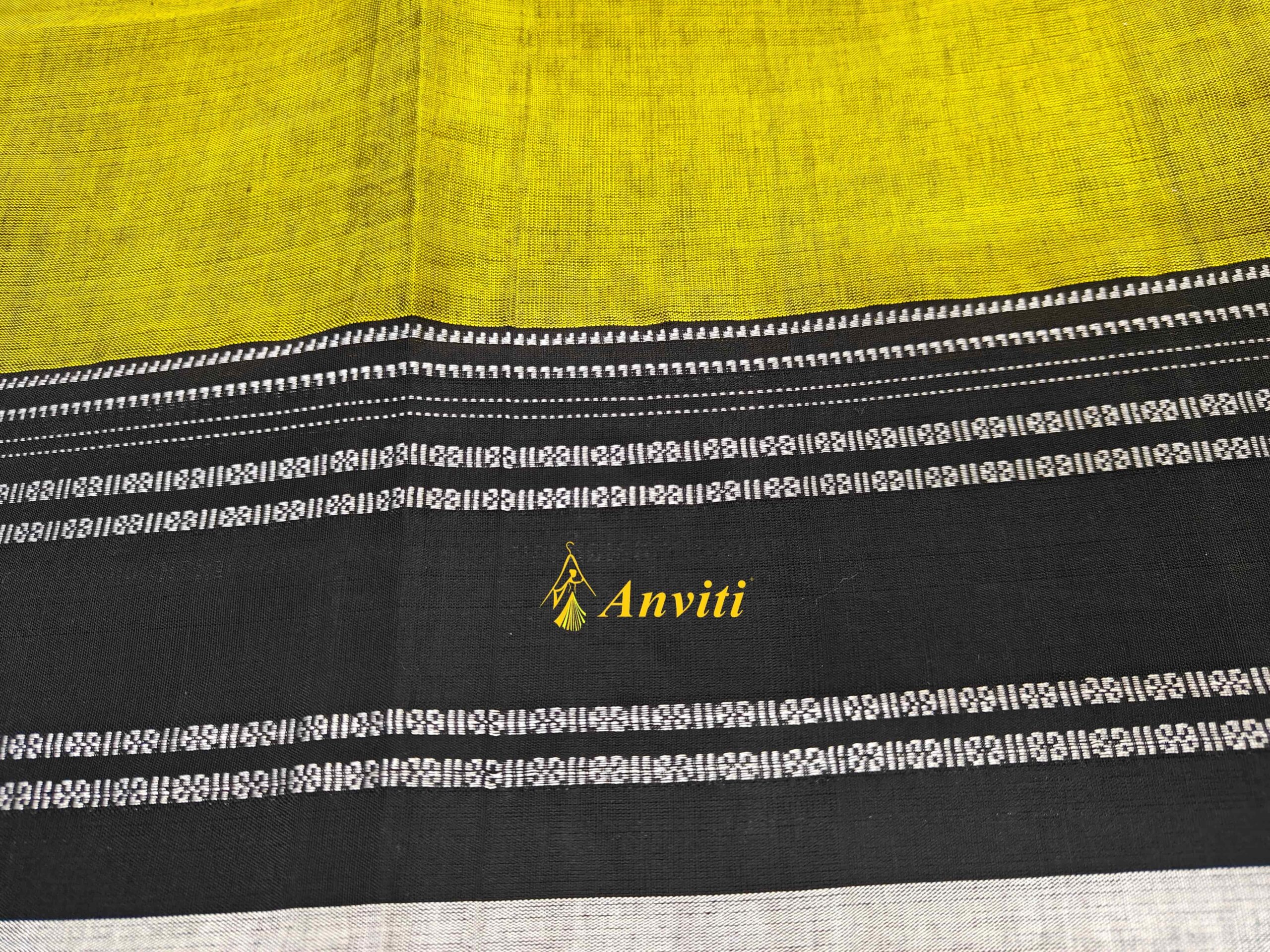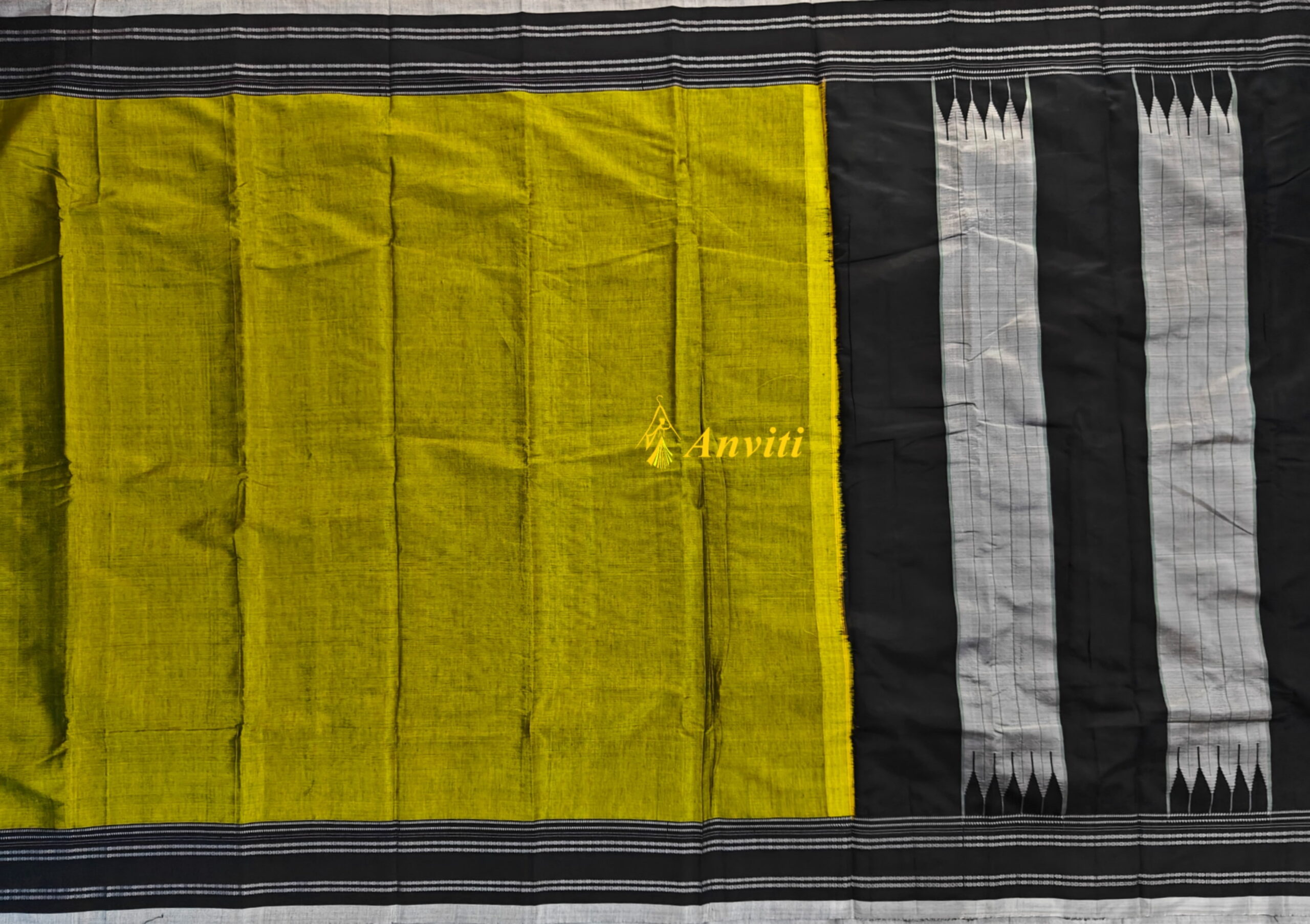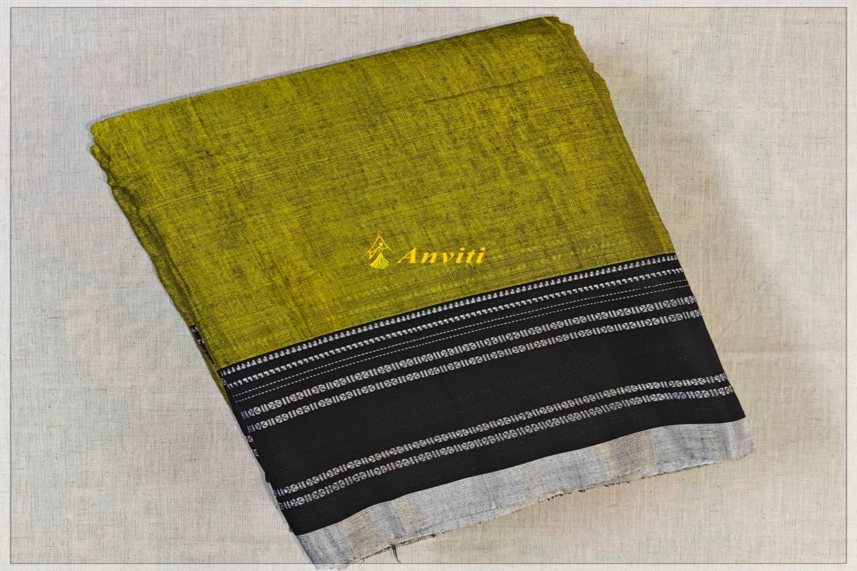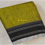 Saree: Olive Green hand-woven Ilkal Viscose Silk Saree with contemporary Black Gayathri border and black and silver color tope teni pallu. The border and pallu are in pure silk.