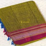 Saree: Olive Green hand-woven Ilkal Viscose Silk Saree with traditional chikki border in magenta pink and pink pure silk tope teni pallu.
