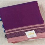 Saree: Onion Magenta color hand-woven Ilkal pure Cotton plain Saree with traditional Chikki Border on peach base and cement grey tope teni pallu. The tope teni pallu is in magenta color on cement grey base.