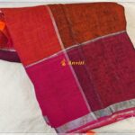 Saree: Pure Linen multi color checks pattern saree with silver zari border and silver zari checks. The pallu has silver zari stripes and multi color tassels – 5.5Mtr