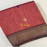 Handwoven peach color Maheshwari Silk cotton saree with resham thread woven border. Saree has small leafy motifs all over and a purple pallu. The purple plain blouse piece has the resham border.