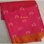 Peachy pink color super lustrous and soft, hand-woven Mangalagiri Silk by Cotton Saree with beautiful white floral handblock prints throughout the border and pallu. Orange leafy block prints are on end of the pallu and on the running blouse piece.