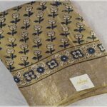 An intricate Ajrakh floral handblock printed dry pista color Dola Silk saree with gold zari woven border. The Self color blouse piece has gold zari buttas and border.